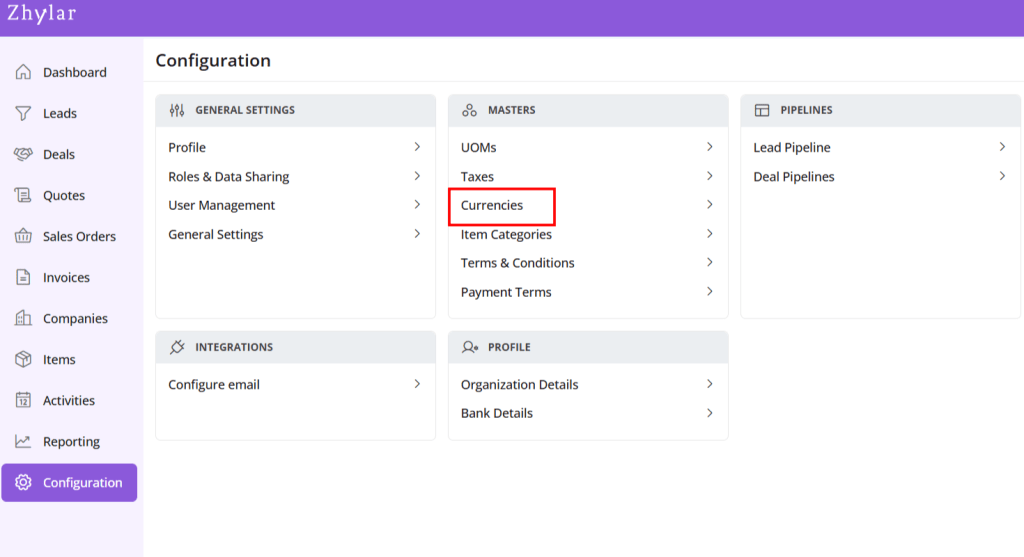 Currency defines the monetary unit used for transactions within the CRM. Zhylar supports multi-currency operations, enabling businesses to handle global deals efficiently. This feature is essential for accurate pricing, reporting, and financial consistency across international markets.