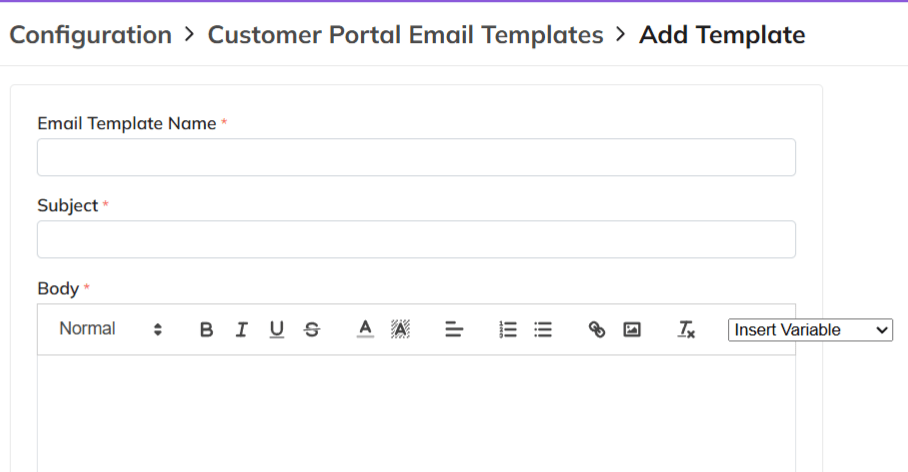- The field options in all templates are the same except in customer portal. Here, only a Template Name, Subject and Body can be added.
