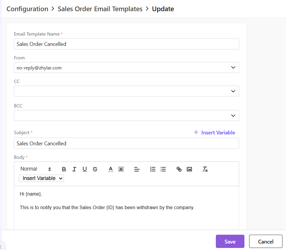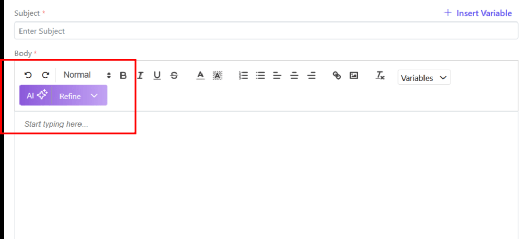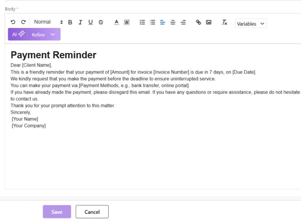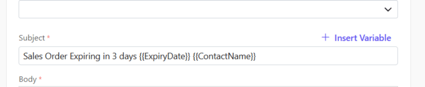 - Insert variables if required to customize your template. Variables are placeholders used to dynamically insert specific data—such as a customer’s name, deal value, or due date—into templates, emails, or documents