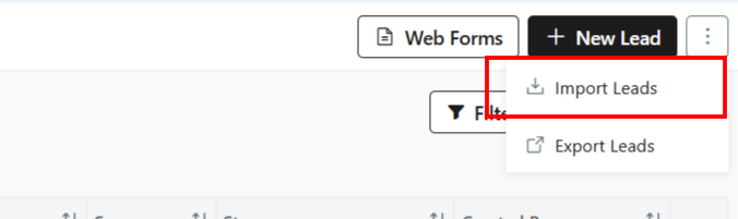 - From the top-right hand corner, click ⋮ 3 dots beside + New Lead