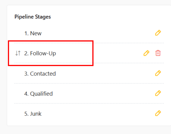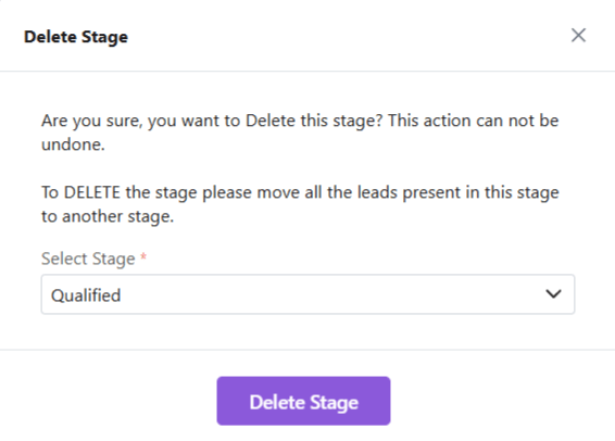 - You will be asked to move leads in that stage to another stage before deletion.