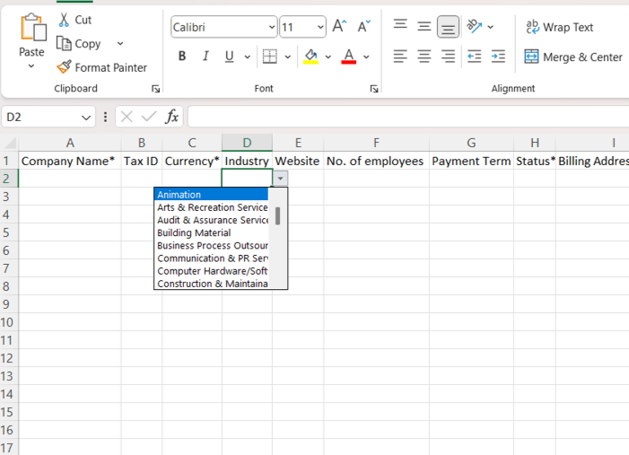 - For others, such as country code, industry and such, a drop-down arrow will be there. You can select one of the pre-filled values.