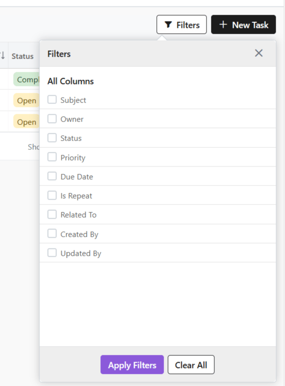 You can filter tasks for easy search by clicking on the Filters button.