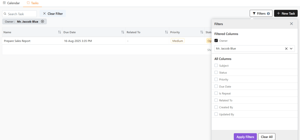 - Now, you will only see tasks whose owner Jaccob Blue is.