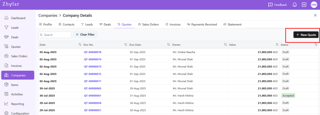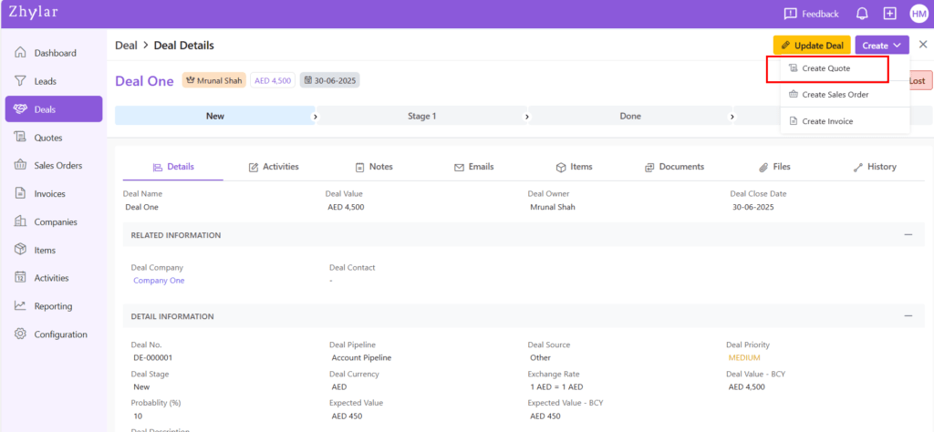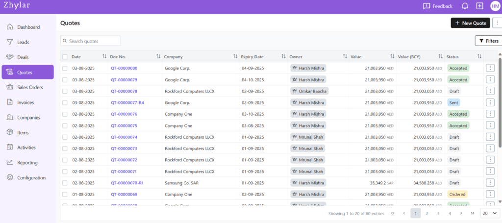 Quotes are formal price proposals you create and share with customers based on their requirements. A quote includes details like products or services, quantities, discounts, taxes, and total value. With Zhylar, you can generate, revise, and send quotes directly from deals. This helps you respond quickly to customers and manage negotiations. It also allows you to move smoothly towards order confirmation.