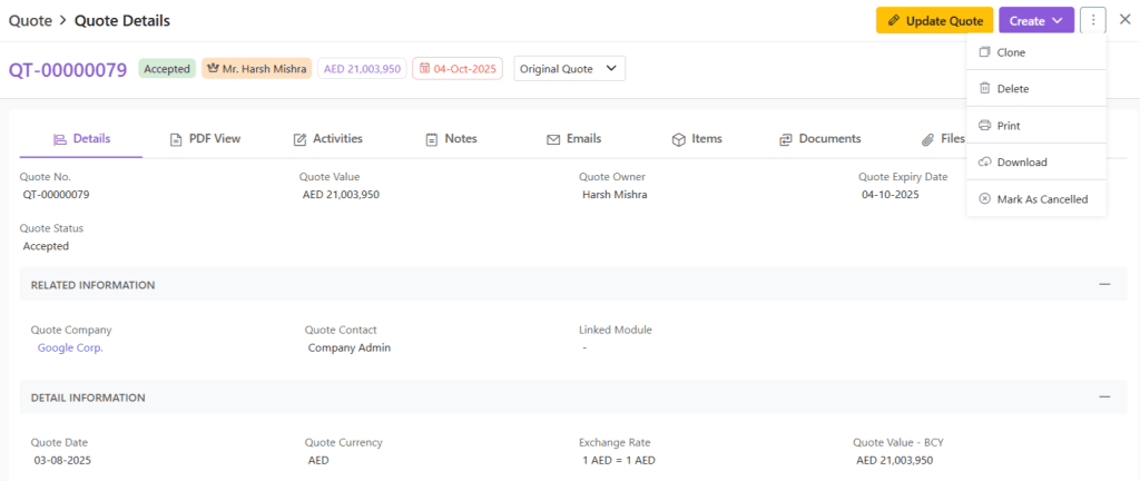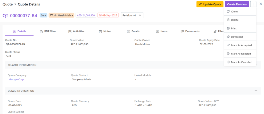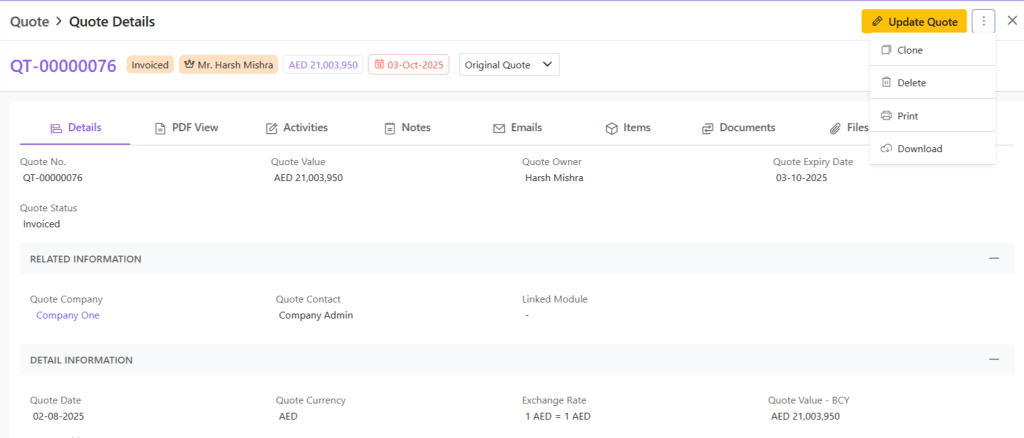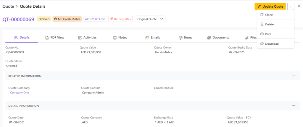 When you click open any quote, you will be provided with a wholistic inside-out-view of the quote in your system. This includes: