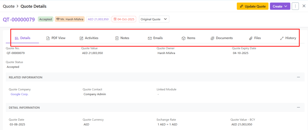 - Quote Timeline– Track creation/update history