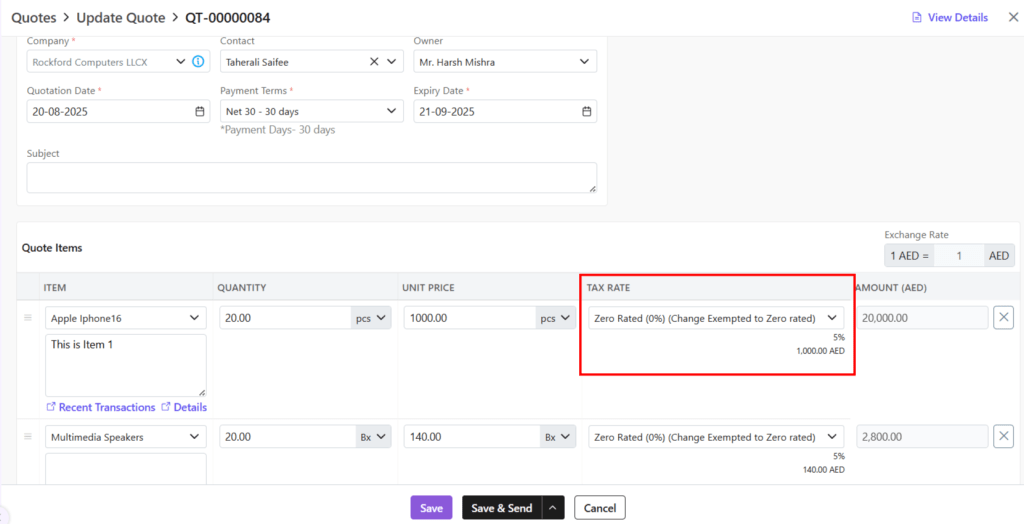 - Exchange Rate: Based on company selection, the exchange rate will be calculated automatically. You can also manually adjust the exchange rate at the document level itself.