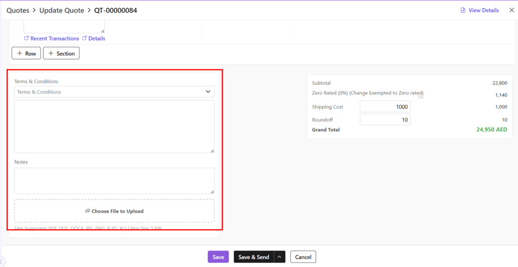 - Terms & Conditions: You can select T&C from the defined T&C templates. Alternatively, you can type them manually as per your need.