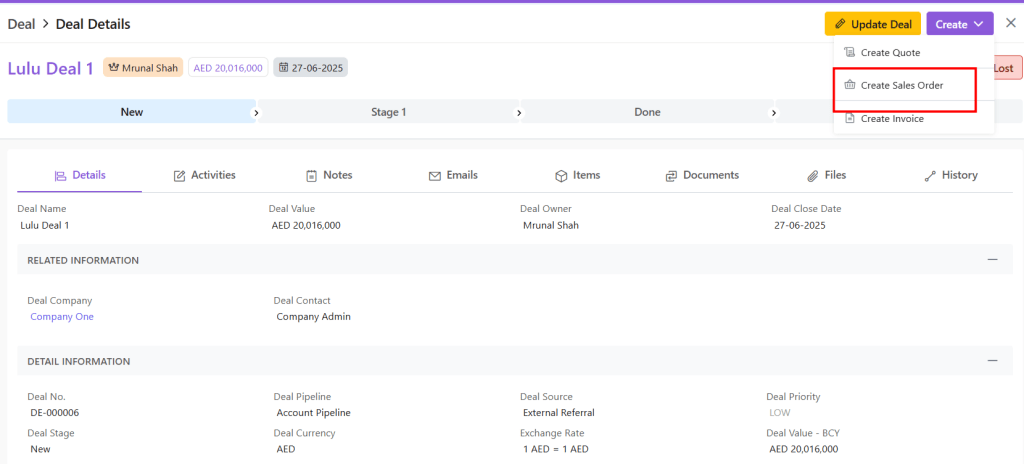 A Sales Order can also be created from a Deal.