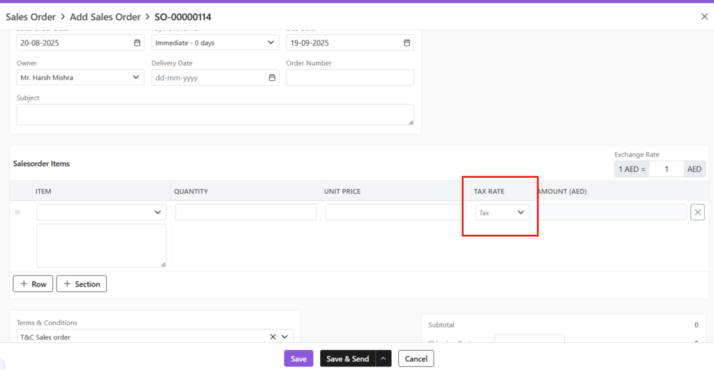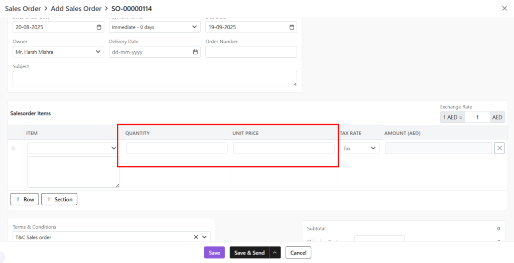 - Company: Select or add a company to whom this Sales Order is being sent