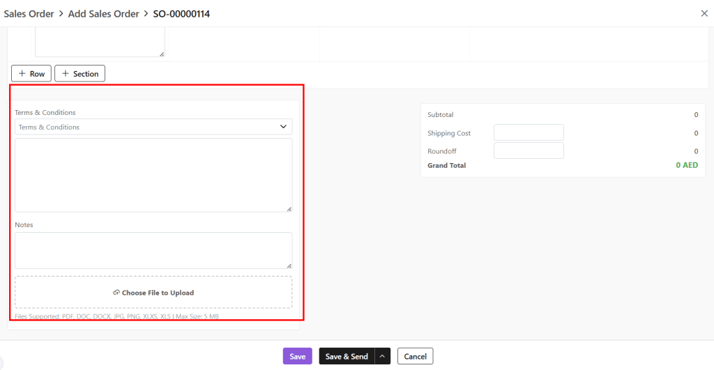 - Terms & Conditions: T&C can be selected from the defined T&C templates. Alternatively, they can be typed manually as per your need.
