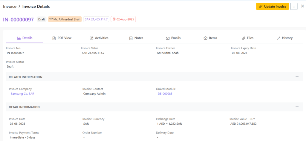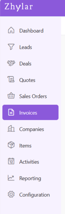 Invoices are official documents generated after a sale is completed, detailing the products or services delivered along with payment terms. They help businesses track receivables, manage cash flow, and maintain financial accuracy. With Zhylar, invoices can be created directly from deals or sales orders. This ensures a seamless transition from closing a deal to collecting payment. Everything operates within one centralised system.