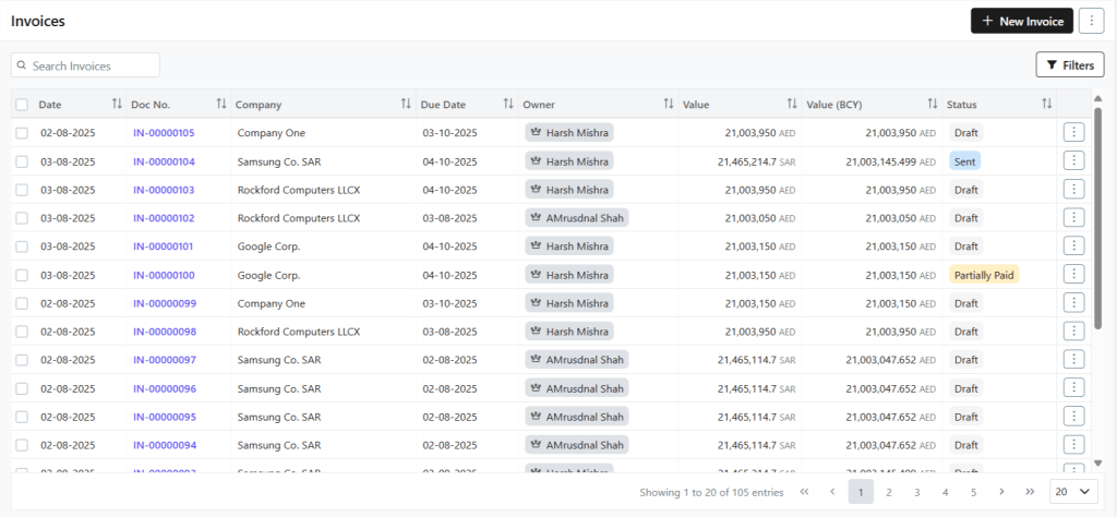 An Invoice lifecycle refers to the complete journey of an invoice—from creation to closure. It starts in the Draft stage, moves to sent and progresses through Unpaid, Partial, Overdue, or Paid stages. Each stage reflects the invoice’s status and helps monitor payments and follow-ups efficiently.