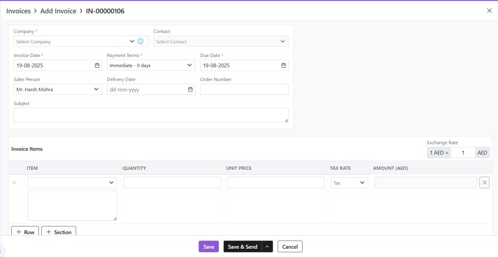 - Company: Select or add a company to whom this invoice is being sent