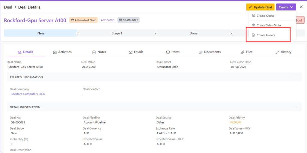An Invoice can also be created from a Deal.