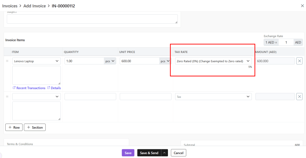 - Tax Rate: The tax will be preloaded based on the item selected. It is defined during the creation of the item. You still have the option to change the tax that is applied to the selected item.