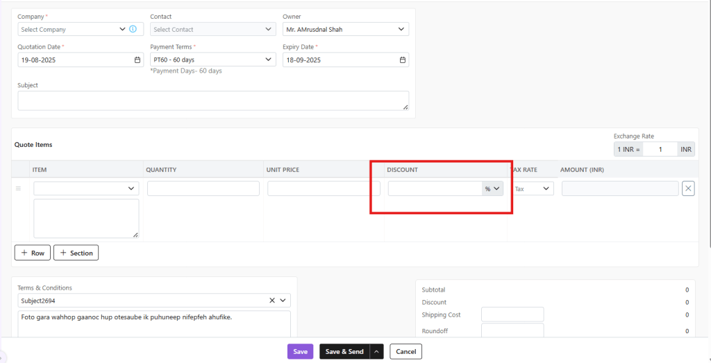 - Terms & Conditions: T&C can be selected from the defined T&C templates or can be typed manually as per your need.