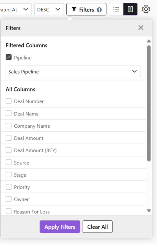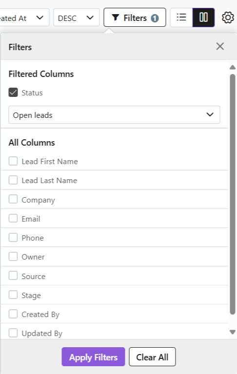 This saves time, reduces errors, and ensures sales teams always focus on the most relevant records. For example, a manager can filter leads generated “this month” or leads by “owner.” Adding more than one filter helps you quickly narrow down to the exact records you need without wasting time.