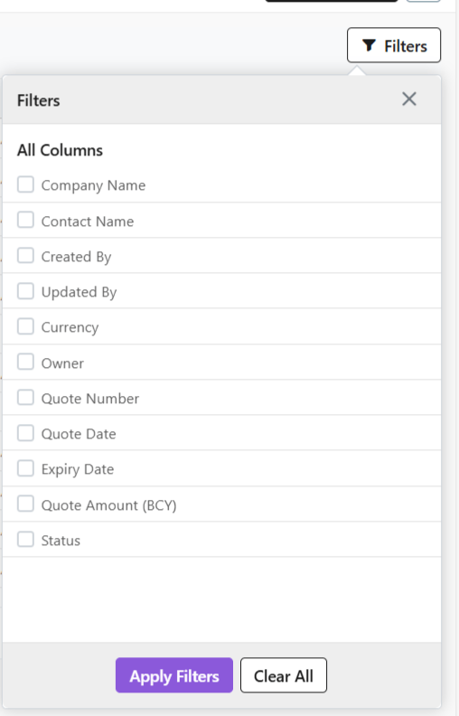 For each module, you can find the Filter button on the top right-hand corner of the page.