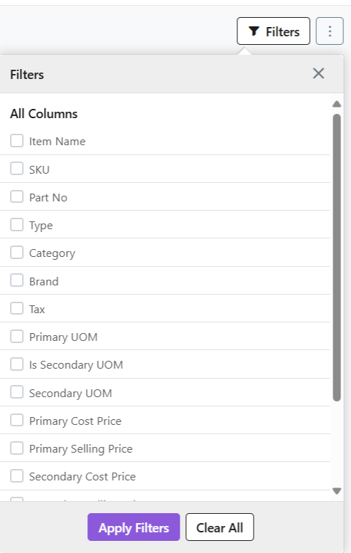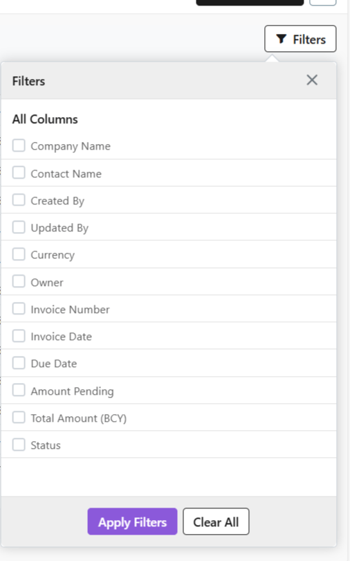 - On the top-right hand corner, select Filters. A list of all the filters will show in a drop-down menu.